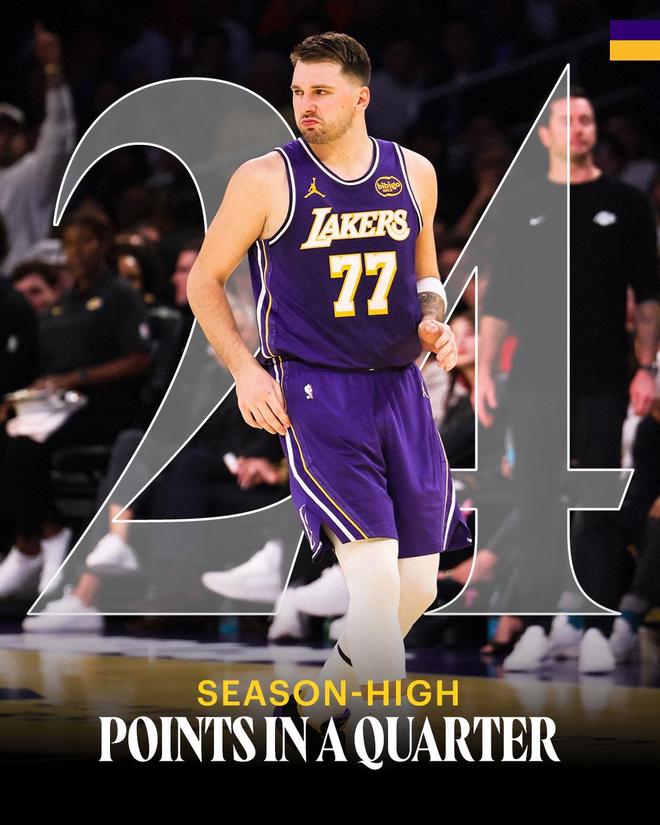 此外,东契奇在此役还刷爆了纪录。第1、东契奇首节拿下24分创下了湖人队史第一节得分新纪录,此前纪录也是由东契奇保持(23分)。第2、东契奇单节24分是湖人队史自2007年的科比后的单节得分新高。第3、这是东契奇职业生涯第26次单节20+,追平詹姆斯,并列历史第6。