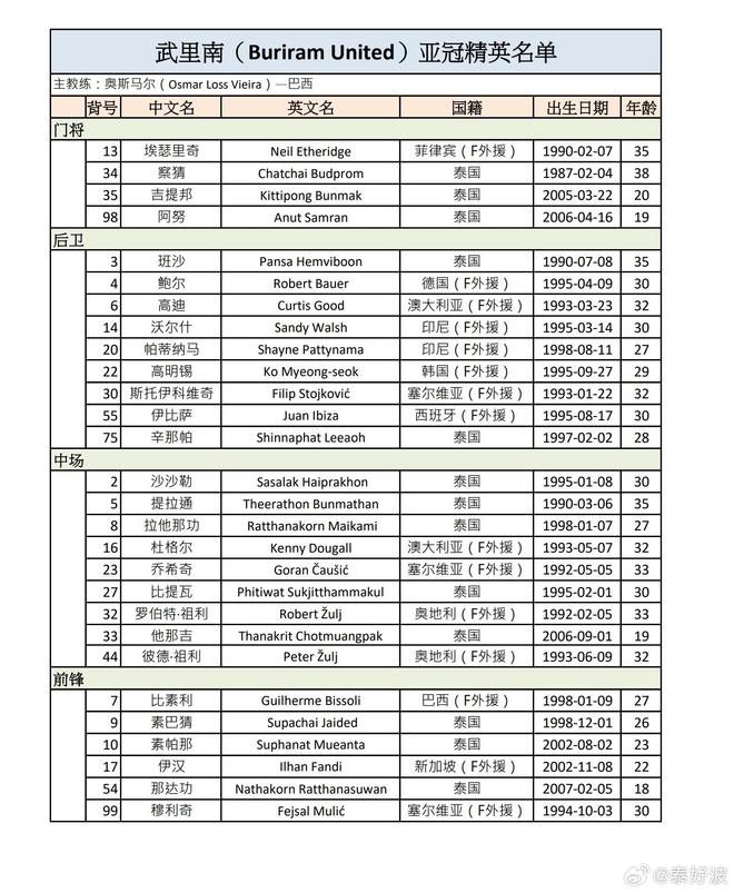 武里南联亚冠精英赛大名单:15名外援在列,素帕那入选